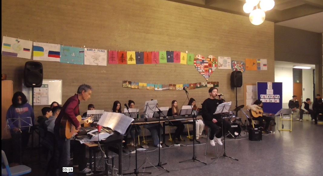 die Lehrerband spielte neben der Weihnachtsbäckerei und We wish you a merry christmas das aus der Serie "Stranger Things" bekannte Running up that Hill. Die Schülerbands aus den Jahrgangsstufen 8, 9 und 10 brachten Freude schöner Götterfunken, Snowman von Sia, Idontwannabeyouanymore von Billie Eilish, Jingle Bells und aus Anlass der Winter-WM in Quatar Waka Waka zu Gehör.