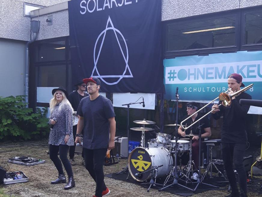 Im Rahmen der Schultour "#OHNEMAKEUP" waren am 15. Juni die Bands Solarjet und Soundbar zu Gast in der Carl-Fuhlrott-Schule. Sie besuchten für jeweils eine Unterrichtsstunde verschiedene Klassen und erzählten aus ihrem Leben als Profiband oder entwickelten gemeinsam mit den Klassen einen Song. Mittags gibt es dann im Innenhof ein kleines OpenAir-Konzert, das Schülern und Schülerinnen und alle anderen Anwesenden zum Mitmachen einlud.